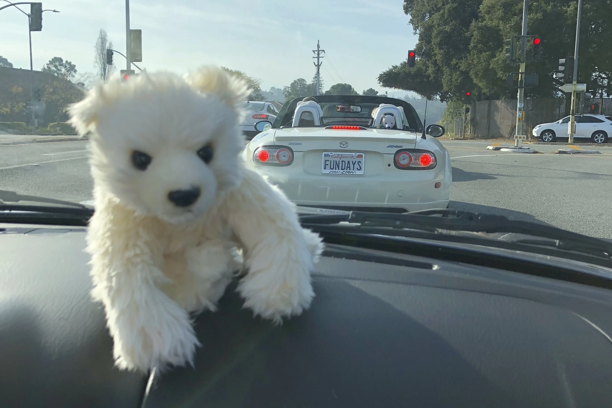 That challenge was accepted. Eighteen from BAMA and two guests from LA, 18 in all, in 10 Miatas, and one OTM (it was a Mazda at least) braved the sunshine and temps in the mid-60’s to drive top down on New Year’s Day. Some of us wore polar bear gear and had polar bear mascots to celebrate the challenge.